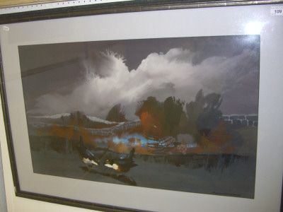 Landscape with two birds in the foreground, a bridge over a river beyond
