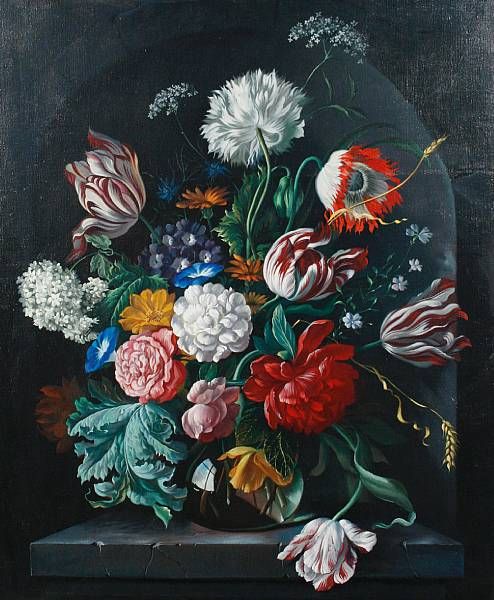 A vase of flowers within a stone niche