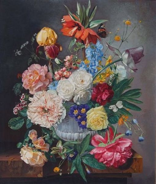 Still Life, flowers in a stoneware vase upon a marble ledge