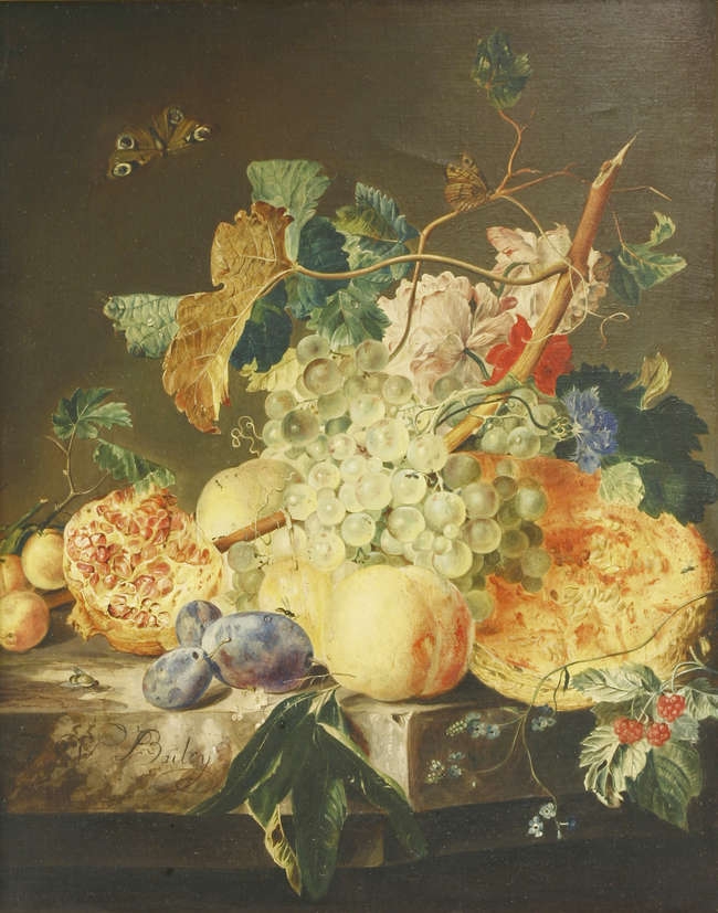 | STILL LIFE OF FRUIT, LEAVES AND BUTTERFLIES ON A LEDGE | |