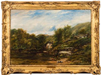 | A salmon fisherman at a Devonshire pool, an overshot mill beyond | |