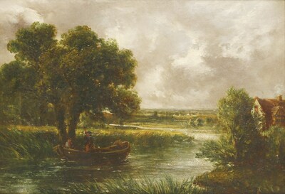 A WOODED RIVER LANDSCAPE WITH FIGURES IN A BOAT