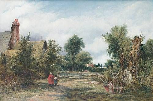 Landscape with figures beside a cottage