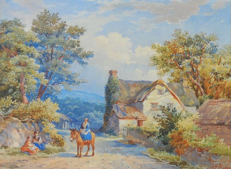 | A rural landscape with a woman on a donkey conversing with woman by the roadside, thatched cottage nearby | |