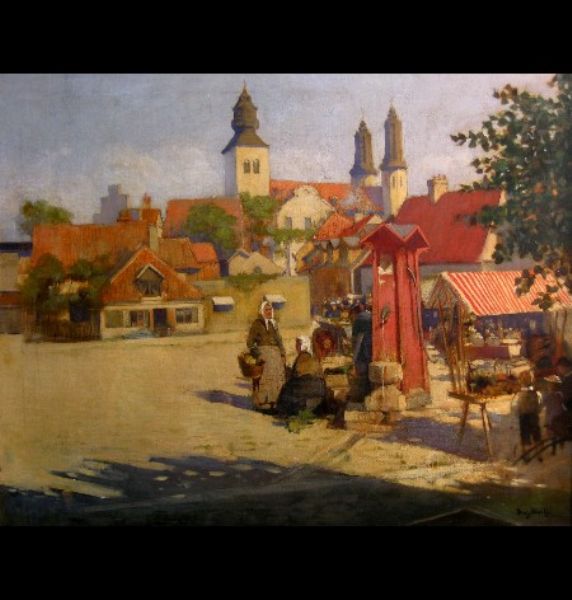 | Continental market place with figures, water pump in the foreground, church and village in the distance | |