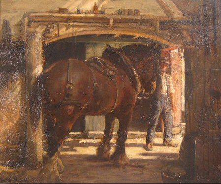 | Going to Work, a study of a man leading a work horse out of a stable | |