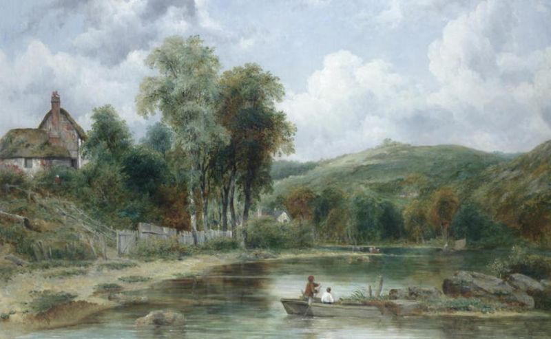 Wooded landscape with figures in a boat