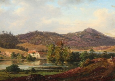 Hidden landscape with a watermill. Unsigned. Oil on mahogany. 21×28 cm. | |