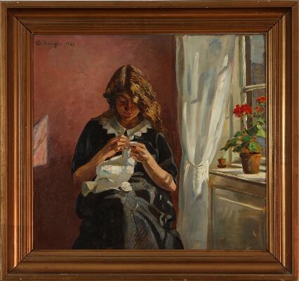 A young girl doing needlework by the window