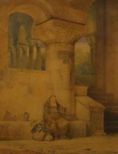 A Monk Seated by Italian Church Buildings