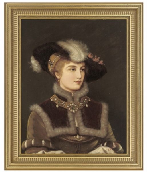 | Portrait of a young lady, bust-length, in a fur hat with a feather and a gold and pearl necklace | |
