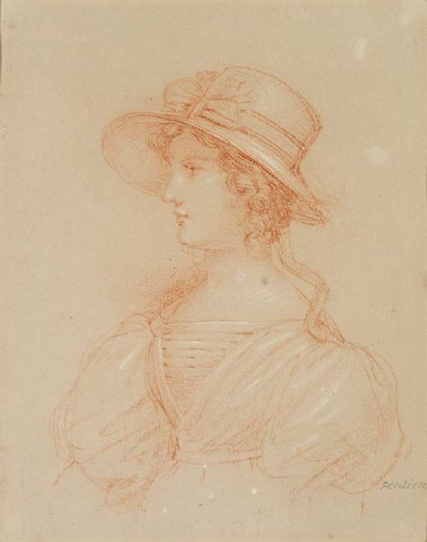 Halbfigürliches Portrait einer jungen Dame im Profil von links mit breitkrempigem Hut