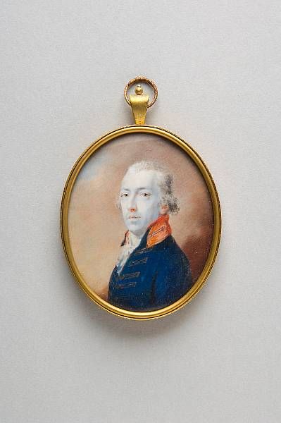 | A Gentleman, wearing blue coat with red collar and gold embroidery, white cravat and powdered hair. | |