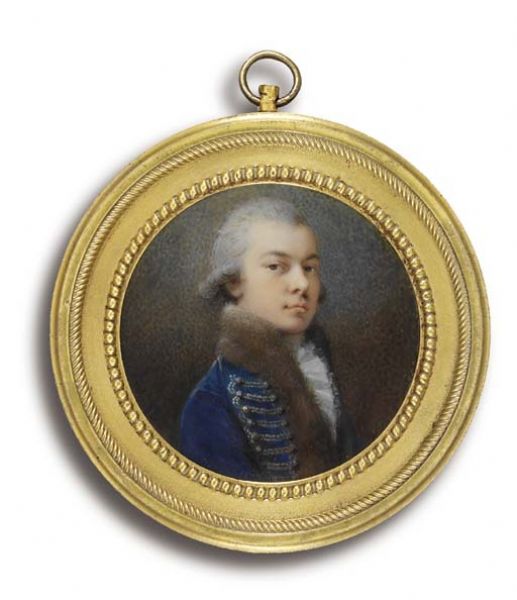 | A young officer in a Hungarian uniform, fur-bordered blue coat with silver lacing, frilled cravat, powdered hair | |