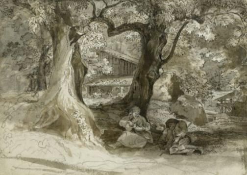 | Peasant man and woman resting under some trees. | |