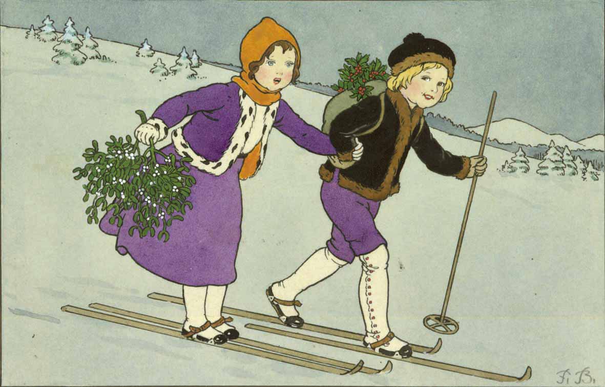 Kinderpaar auf Skiern mit Mistelzweig u. Ilex