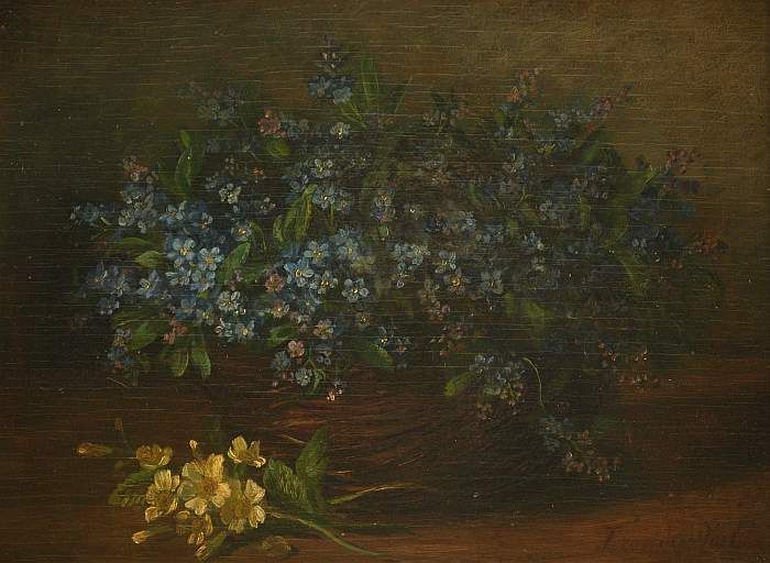 Üppiges Vergissmeinnicht - Arrangement im Flechtkorb.