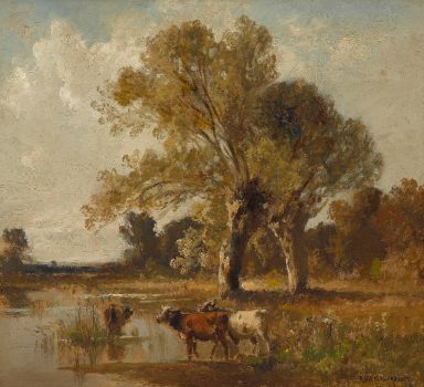 Baumlandschaft mit Kühen am Wasser