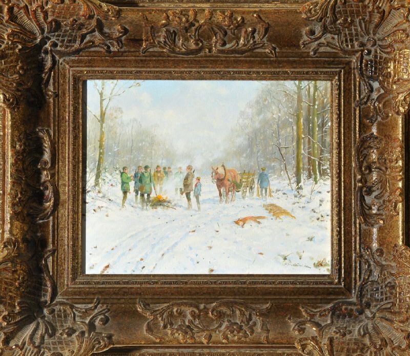 | Die Jäger wärmen sich nach erfolgreicher Fuchsjagd am Lagerfeuer im Winterwald | |