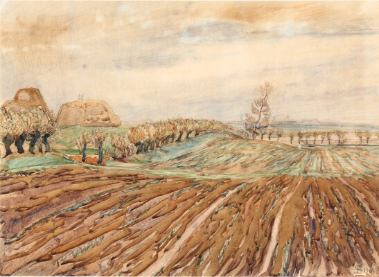 | Landscape with ploughed fields and pollarded trees | |