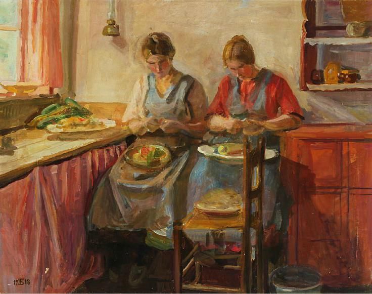 | Sunlight in the kitchen with two young women preparing vegetables. | |