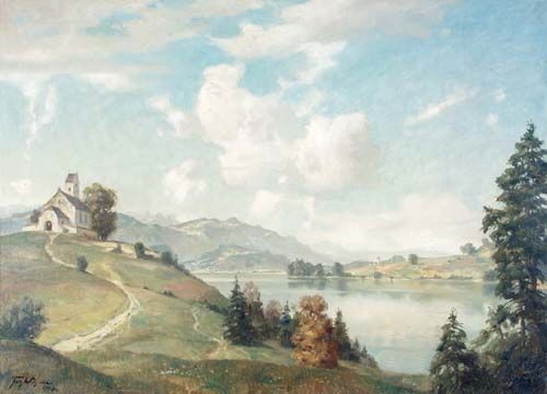 Bayerischer See mit Kapelle auf einer Anhöhe in sommerlicher Landschaft