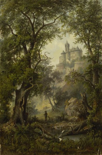 Jäger im Wald nahe einer Burganlage