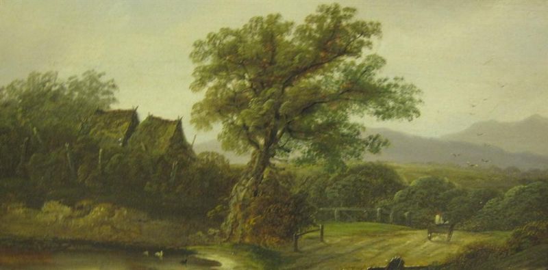 A wooded Landscape with a figure and cart on a track