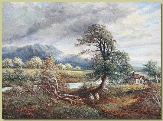 | Children feeding ducks by a pond in a wooded landscape and children fallen trees with turbulent river beyond | |
