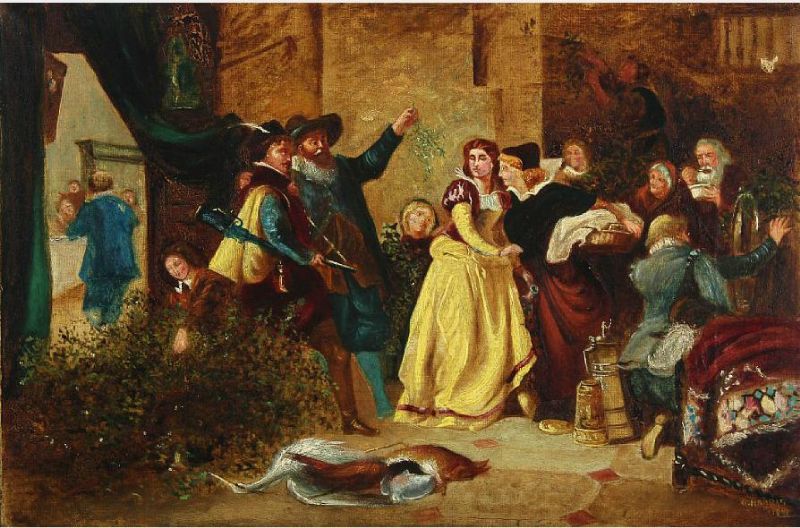 Scene with gentlemen under a mistletoe