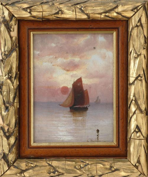 Two marine views: One depicts a water-bound lighthouse; the other depicts boats at sunset