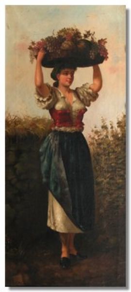 Full-length portrait study of a Continental girl, holding a wicker basket of fruit on her head
