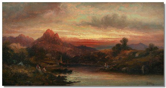 Lake scene at dusk with fisherman