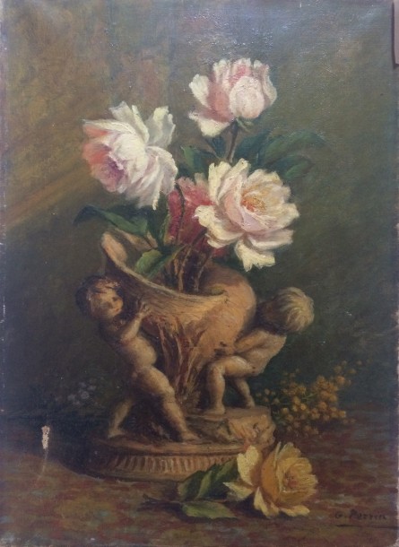 Vase de fleurs retenu par des amours