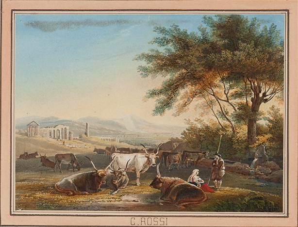 Italienische Landschaft mit Schäferpaar und Kühen – im Hintergrund Ruinen