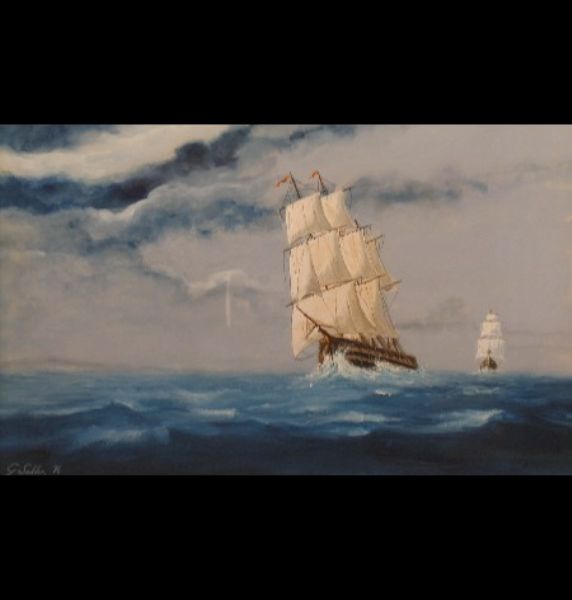 triple masted ships in full sail on rough seas