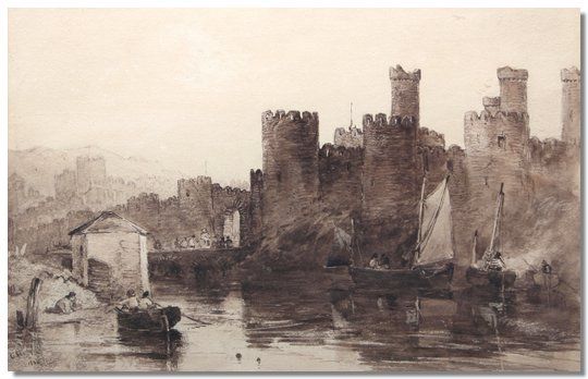 Figures rowing on a river with arched bridge and castle beyond