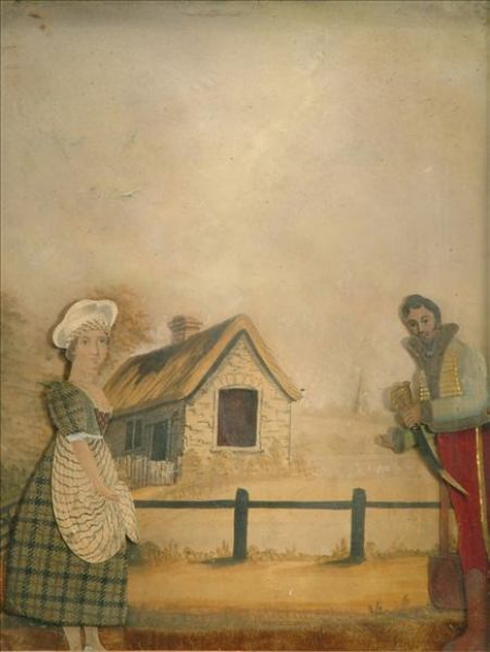 Soldier and a peasant girl before a cottage