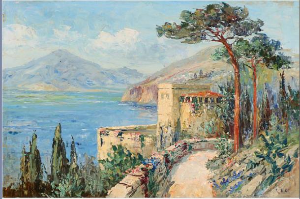 | Coastal road in Sorrento bay. View towards Vesuv | |
