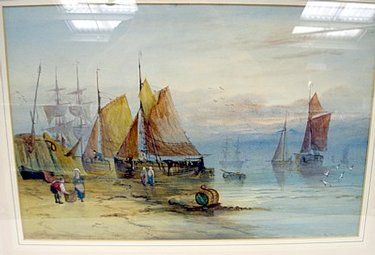 figures tending boats at low tide