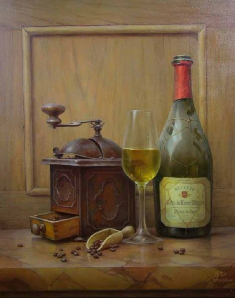 Still Life with Bottle of Cote-du-Rhone, a Wine Glass and a Coffee Grinder