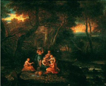 | Une assemblée de sept femmes vêtues à l'antique sur la berge d'une rivière en forêt | |