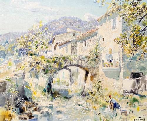 Continental village scene with woman washing clothes