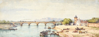 Busy River Scene with Steam Train Crossing a Viaduct
