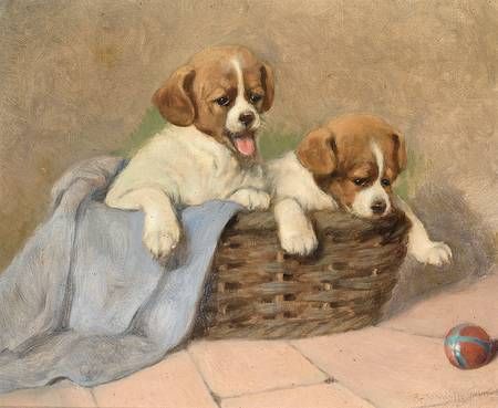 | Zwei Bernhardinerwelpen im Korb schauen nach einem Ball. | |