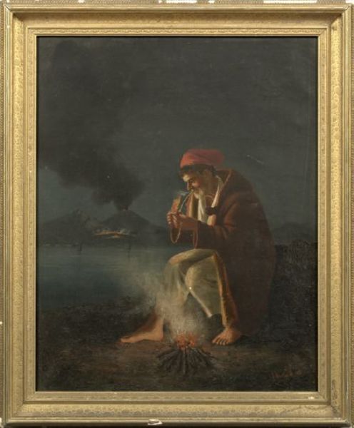 Peasant Smoking Pipe, Mount Vesuvius Visible in the Distance