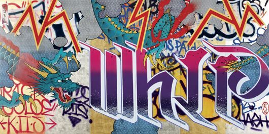 | Acrylic Spray-paint, acrylic, felt-tip pen, gold and silver leaf and Mean Streak on six panels. | |
