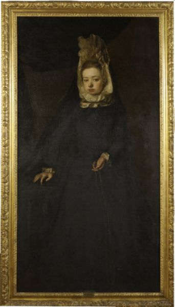 | A portrait of Margaret O'Cahan, standing in a black habit, and holding a string of rosary beads. | |