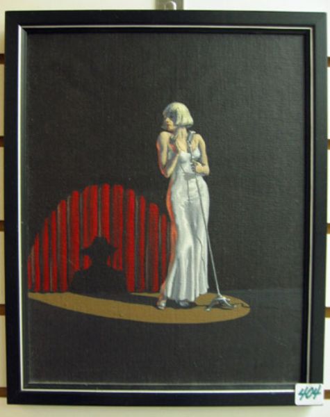 | A torch singer in long white dress with shadow of man in spotlight | |