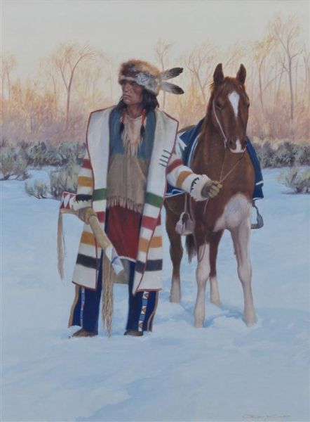 Native American Man with Horse in the Snow